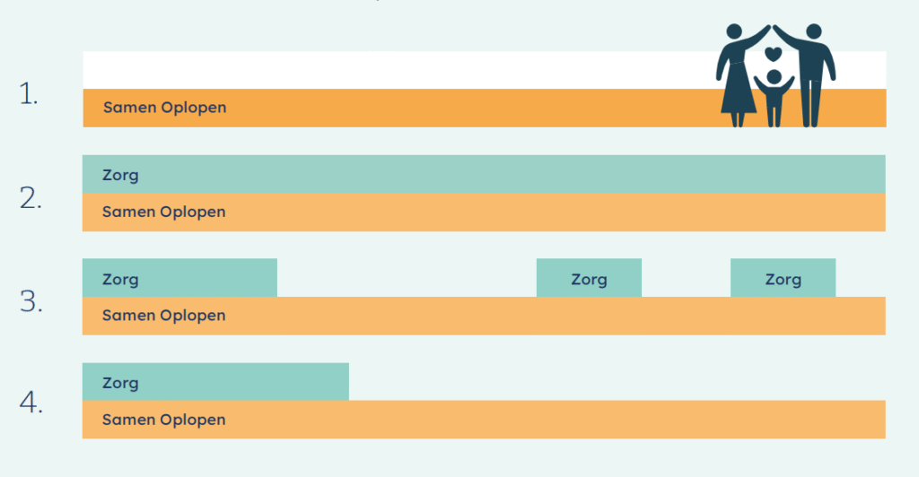 Samen Oplopen kan ook samen met de formele zorg hulp bieden of het overnemen van de zorg als deze moet stoppen. Waar de expertise van de coördinator te kort schiet, volgt doorverwijzing naar andere organisatie en wordt het gezin ‘warm’ overgedragen. Omdat de coördinator het gezin en het professionele netwerk goed kent, kan er vlot bepaald worden welke hulpverlening het best voor het gezin werkt. Samen Oplopen (coördinator en vrijwilliger) blijft betrokken bij het gezin en de coördinator stemt af met de hulpverlening. Fluïde op- en afschalen dus. Zo bieden wij doorgaande steun aan het gezin.
